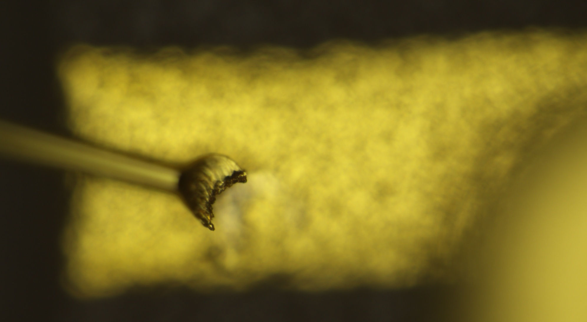 Switching to the metallurgical microscope in a top-down view, looking at a good bond first, we can see a rough textured surface on the gold contact pad, with the gold wire coming in from one side and compressed into a crescent shape by the ball-bonding capillary (hence why some sources refer to the second bond as a “crescent bond”). The gold wire and gold pad appear to be well connected, and a deep circular indentation is visible in the pad which goes through the gold into a silvery base metal.