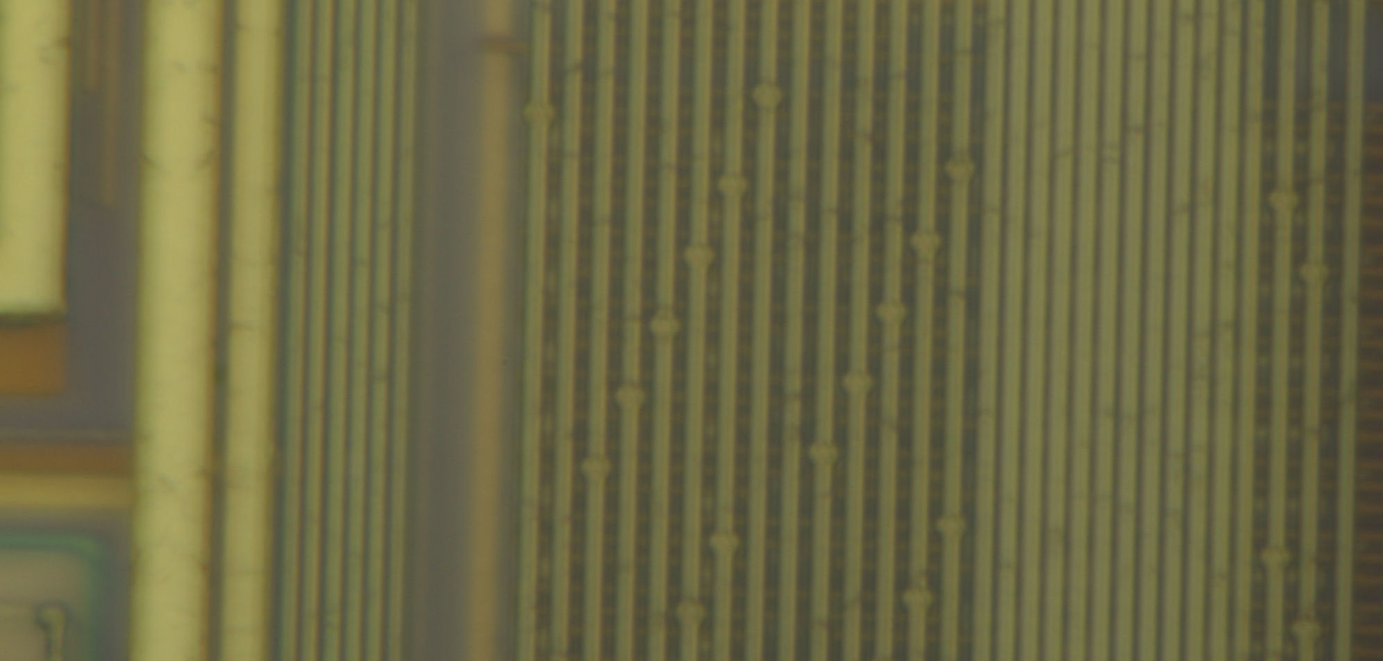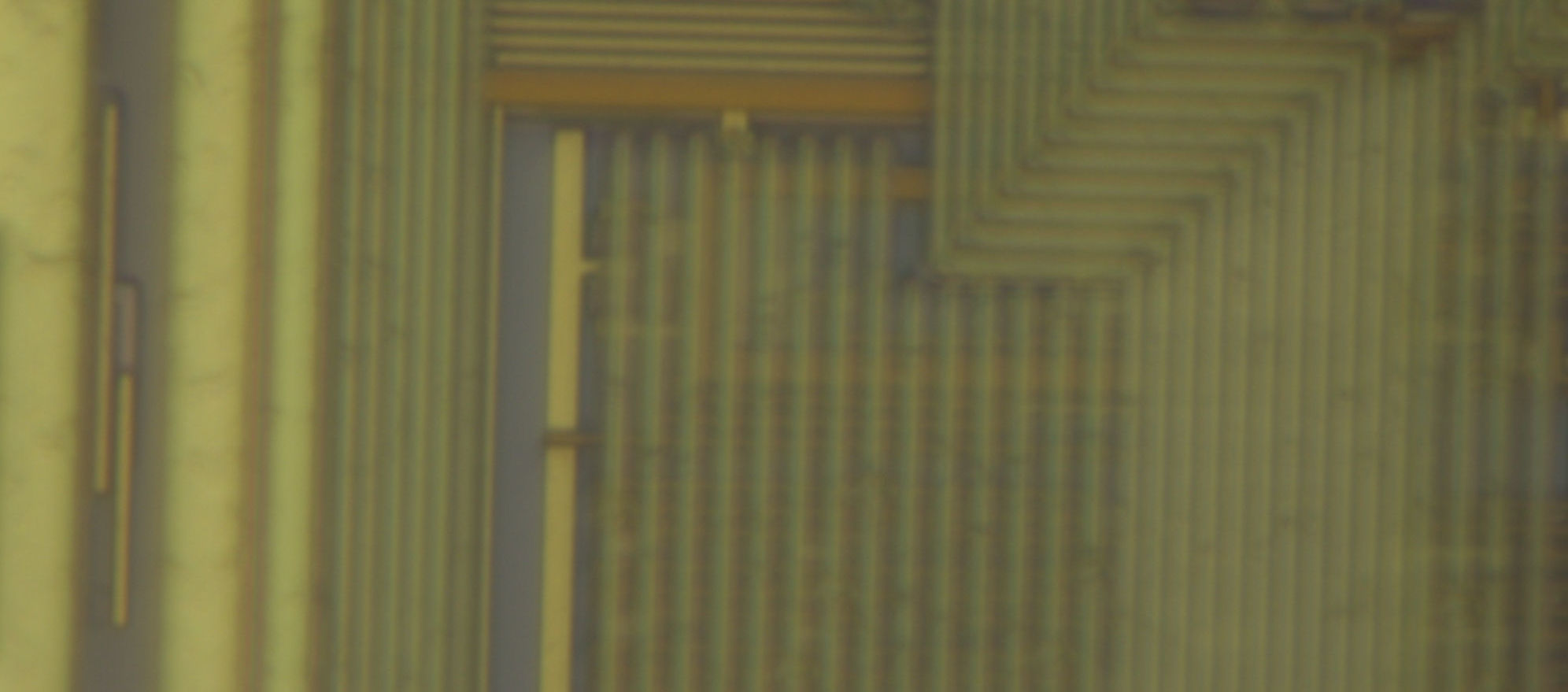 Looking at some of the analog areas which are less dense than the digital, it’s obvious that the device is made on a planarized process with three aluminum metal layers. The three metal layers show up as a light straw color, a darker brown, and another light straw color although it is easy to disambiguate metal 1 and 3 by depth of focus at high magnifications. A greenish layer is also visible below metal 1, likely polysilicon.