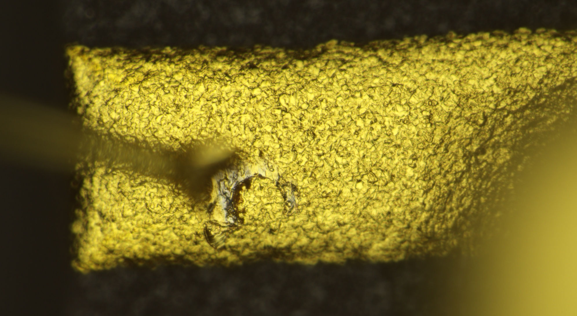Switching to the metallurgical microscope in a top-down view, looking at a good bond first, we can see a rough textured surface on the gold contact pad, with the gold wire coming in from one side and compressed into a crescent shape by the ball-bonding capillary (hence why some sources refer to the second bond as a “crescent bond”). The gold wire and gold pad appear to be well connected, and a deep circular indentation is visible in the pad which goes through the gold into a silvery base metal.