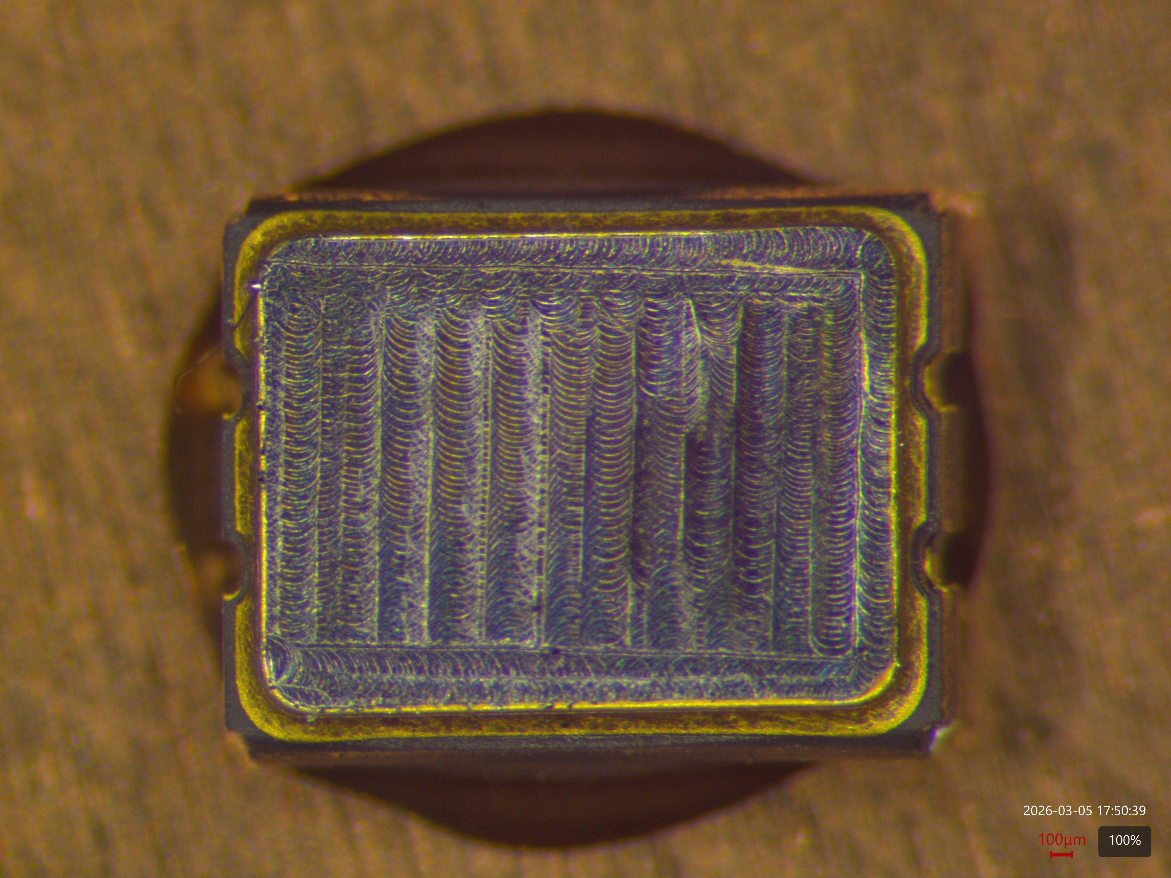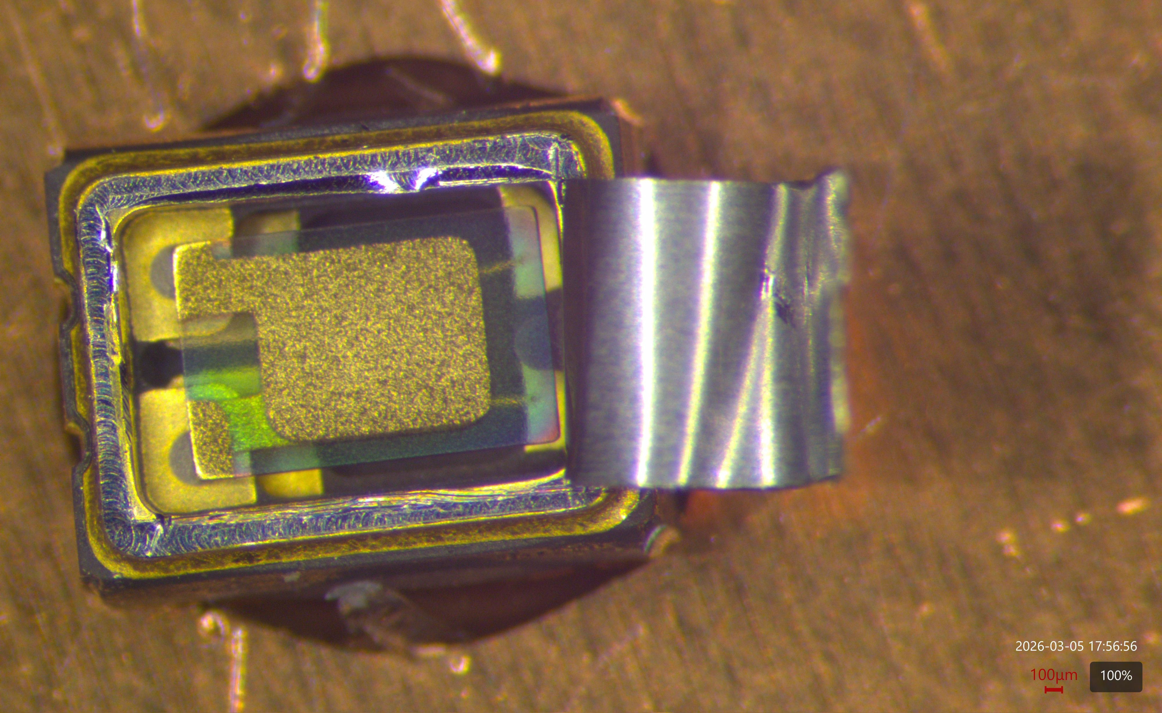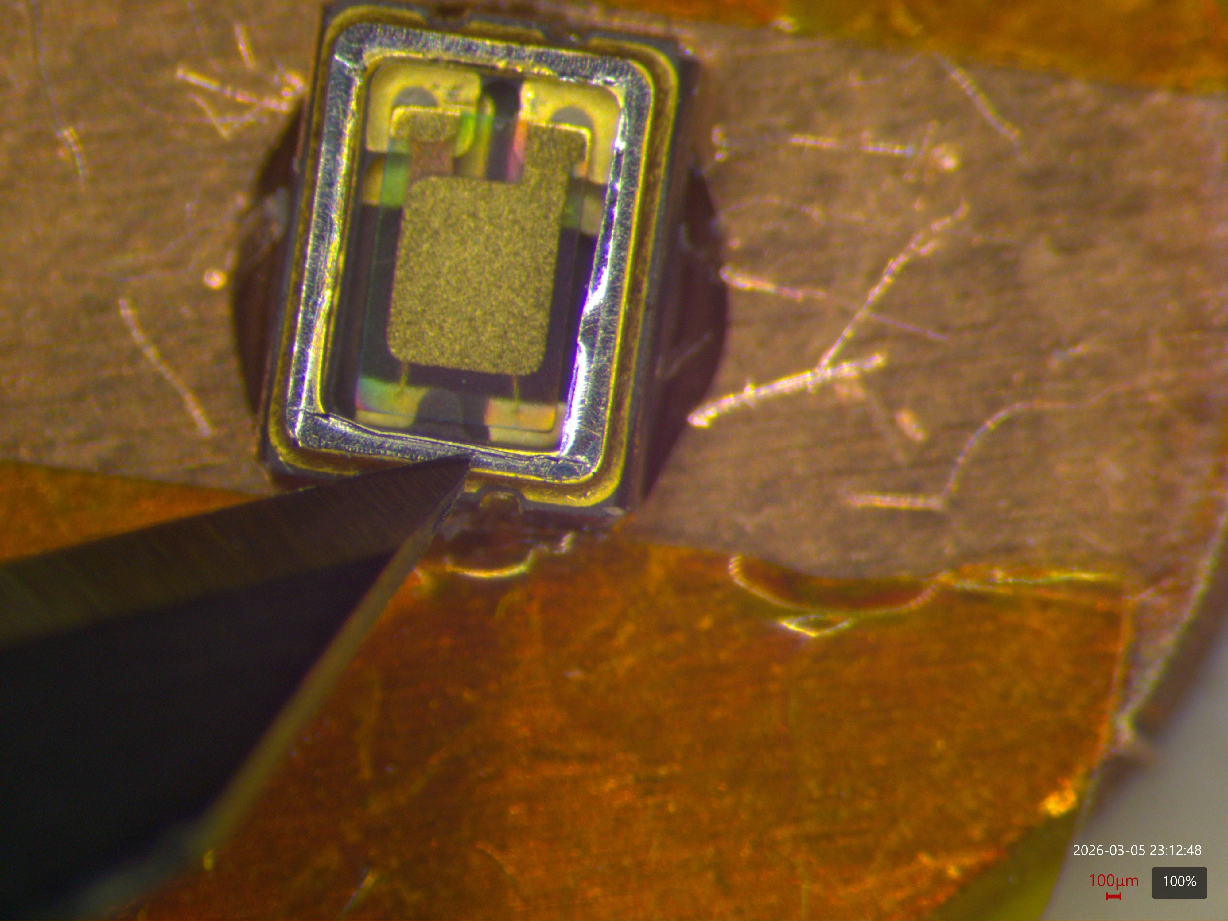 I spent quite a bit of time going over the entire surface of the quartz sheet with the 20x objective looking for any sign of fractures, chips, or damage, as well as inspecting both of the electrical connections from the crystal to the package for cracks or any sign of electrical defects. And I found nothing. This quite surprised me, because I expected the failure mode of a sonicated quartz oscillator to be “shake the resonator to pieces or rip it off the mount” and I was seeing nothing of the sort.