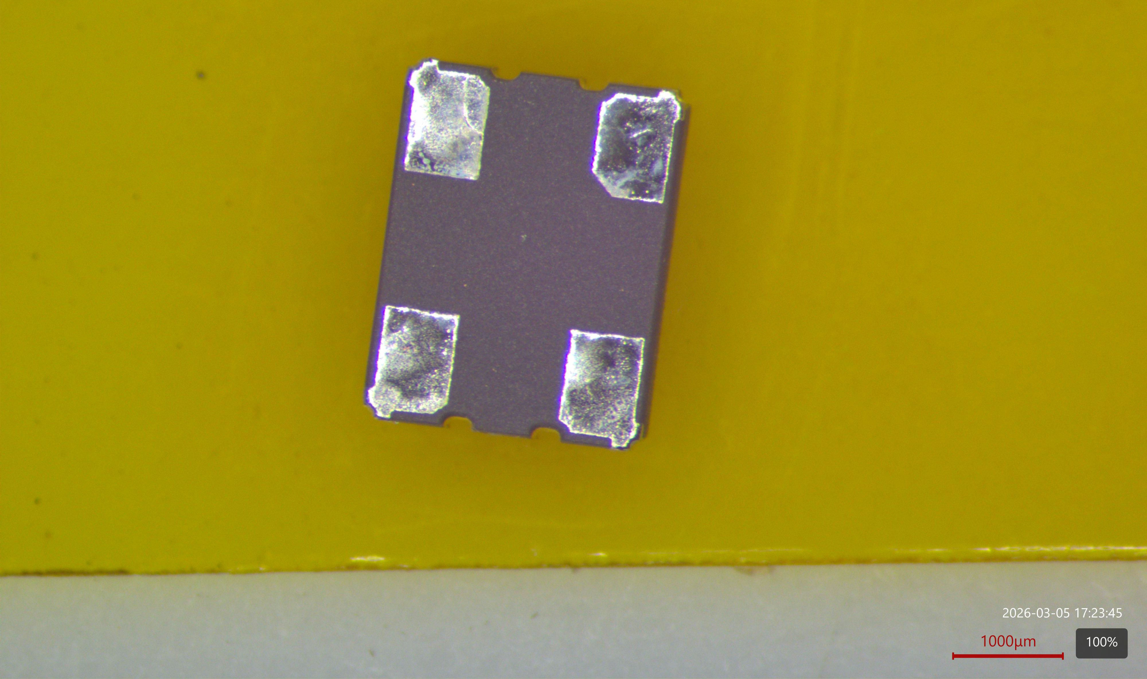 The TCXO is packaged in a 3.2 x 2.5 mm hermetically sealed ceramic package with a metal lid. It was externally unremarkable, with no visible damage.