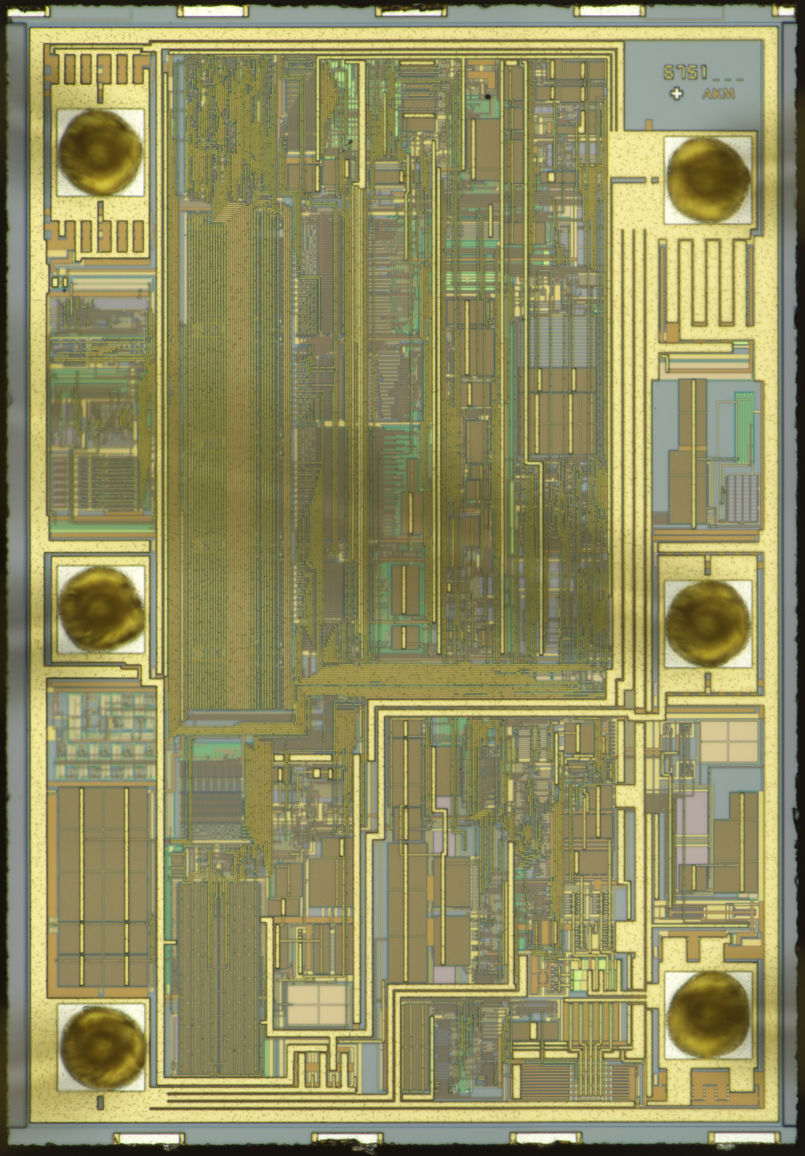 I’m far from an expert at reading analog VLSI layout so I didn’t dig deeper - I can recognize some structures like large capacitors (big solid colored rectangles on lower layers) and polysilicon resistors (long skinny squiggles on the green layer), but didn’t attempt to deprocess the device or do extensive reverse engineerign.